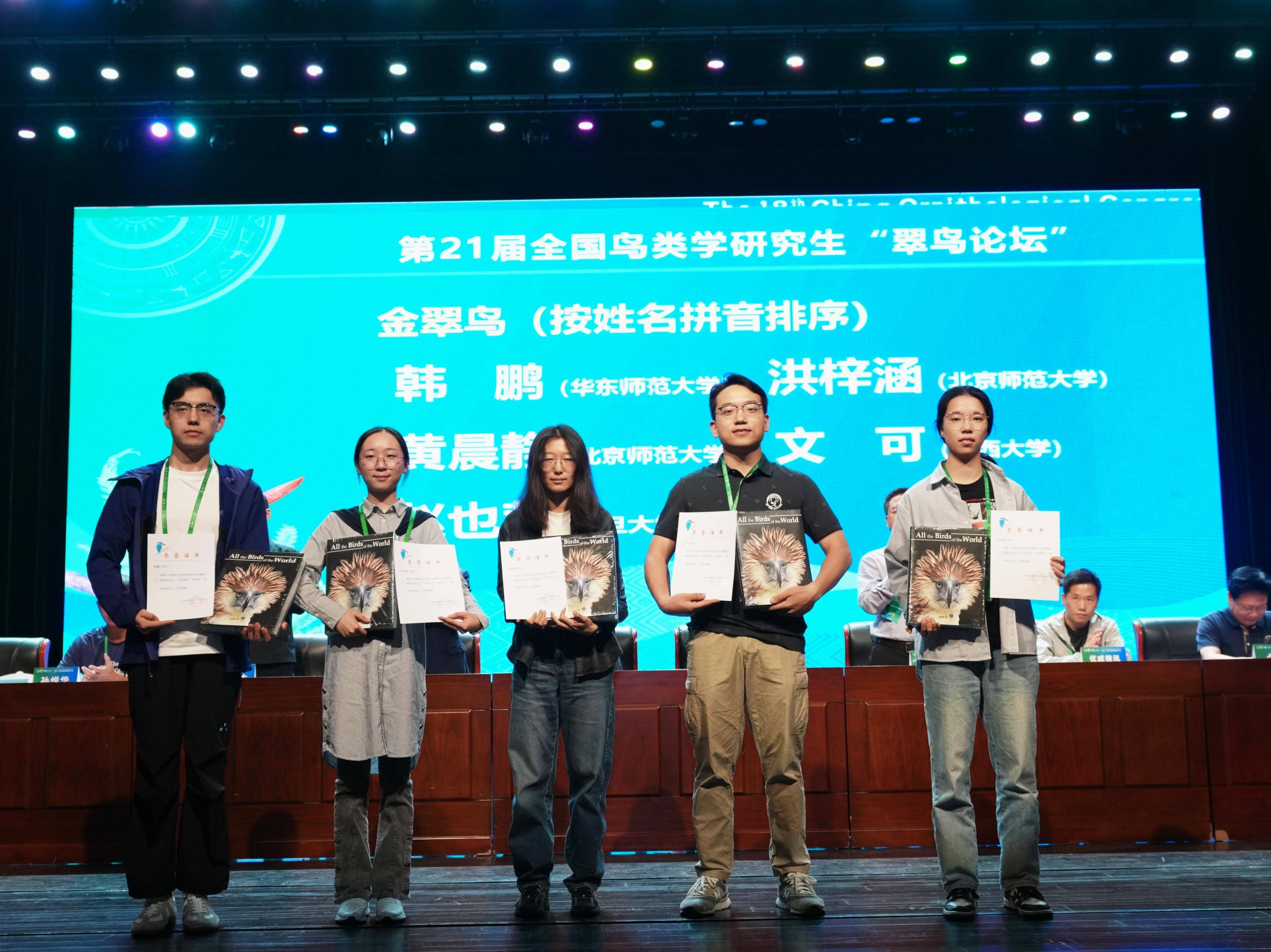 同期举办的第21届全国鸟类学研究生翠鸟论坛上,我院研究生再创佳绩:洪梓涵、黄晨静荣获最高荣誉“金翠鸟奖”,赵晨阳获“银翠鸟奖”。在论坛优秀墙报评选中,高俪纯、李家惠、凌菲阳、张天霈四位同学荣获“优秀墙报奖”,充分展现出我院研究生扎实的学术功底与蓬勃的创新活力。