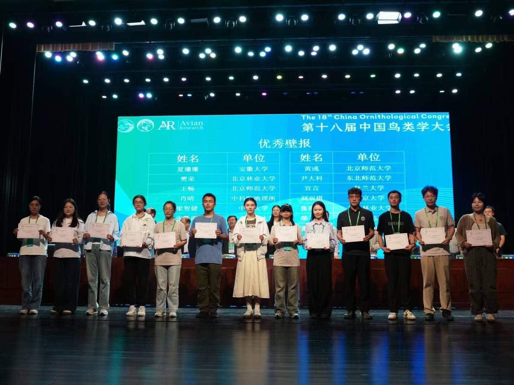 在大会颁奖环节,张敬刚老师荣获“郑光美鸟类研究新秀奖”,该奖项旨在表彰在鸟类学研究中展现出突出发展潜力的青年学者。我院师生在其他学术奖项中也表现优异:赵晨阳、汪卉、李东阳、弓瑞豪荣获“优秀报告奖”;张天霈、黄彧、王畅、柴子文荣获“优秀壁报奖”。