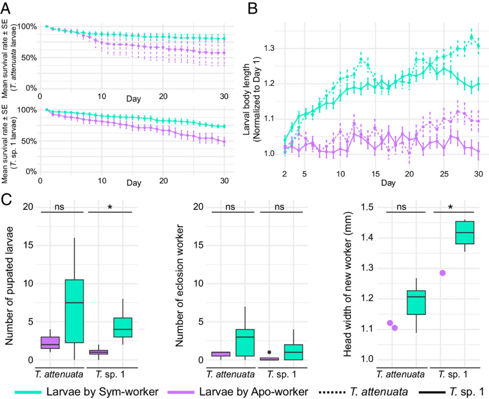 研究团队发现,与正常蚁群相比,去除工蚁体内的共生细菌后,蚁群中幼虫生长显著减缓、死亡率升高,发育成工蚁后的体型也明显变小(图4)。这表明,共生细菌的代谢产物不仅滋养工蚁自身,更对幼虫的生长发育和整个蚁群的健康至关重要。进一步的稳定同位素示踪实验(饲喂¹⁵N-标记尿素)证实,正常工蚁的血淋巴及所照料幼虫体内,多种氨基酸出现显著的¹⁵N标记,而无菌工蚁组则无此现象,这为细菌驱动蚁群内部氮元素的回收和转化提供了直接证据。