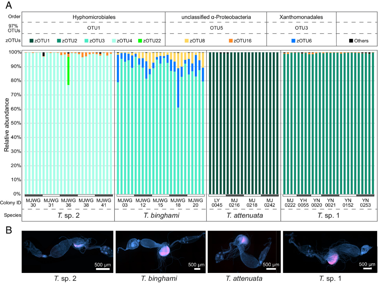 图2 四种 T. nigra 种团工蚁体内共生菌组成和定殖位置